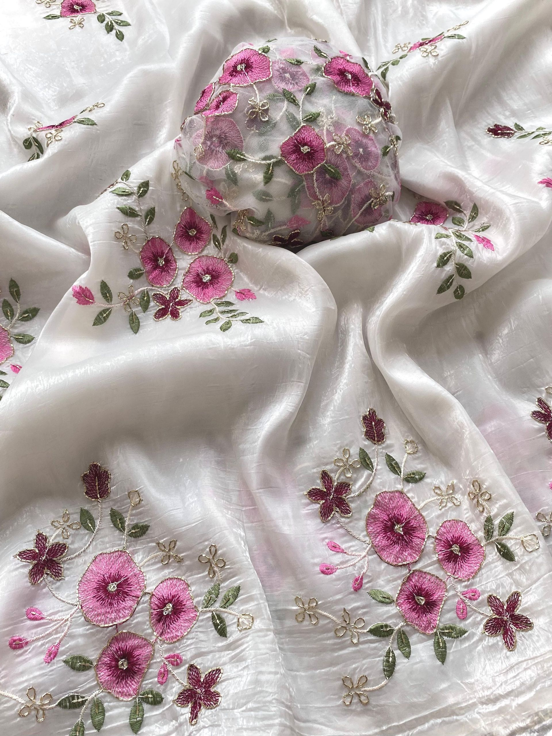 Elegant crush silk saree with beautiful Handwork floral embroidery